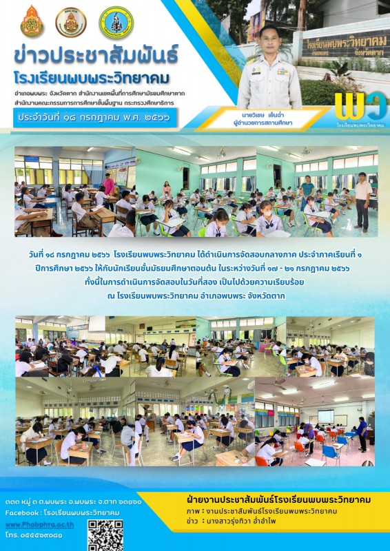 วันที่ 18 กรกฎาคม 2566 นายวิเชษ เย็นฉ่ำ ผู้อำนวยการโรงเรียนพบพระวิทยาคม พร้อมด้วย นายสมคิด พาวงศ์ รองผู้อำนวยการโรงเรียนพบพระวิทยาคม ลงพื้นที่ตรวจเยี่ยมสนามสอบการวัดผลสัมฤทธิ์กลางภาคเรียนที่ 1 ปีการศึกษา 2566 วันที่ 2 ของการสอบ เพื่อให้กำลังใจนักเรียน และคณะครูผู้คุมสอบ |