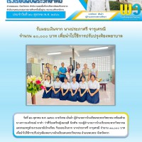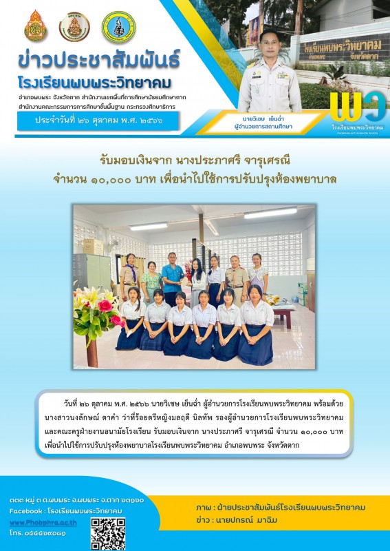 วันที่ 26 ตุลาคม พ.ศ. 2566 นายวิเชษ เย็นฉ่ำ ผู้อํานวยการโรงเรียนพบพระวิทยาคม พร้อมด้วย นางสาวนงลักษณ์ ตาคำ ว่าที่ร้อยตรีหญิงมลฤดี นิลทัพ รองผู้อํานวยการโรงเรียนพบพระวิทยาคม และคณะครูฝ่ายงานอนามัยโรงเรียน รับมอบเงินจาก นางประภาศรี จารุเศรณี จำนวน 10,000 บาท เพื่อนำไปใช้การปรับปรุงห้องพยาบาลโรงเรียนพบพระวิทยาคม อําเภอพบพระ จังหวัดตาก |