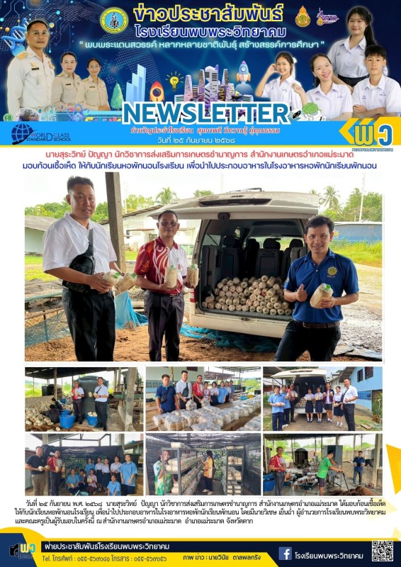 วันที่ ๒๕ กันยายน พ.ศ. ๒๕๖๘ นายสุระวิทย์ ปัญญา นักวิชาการส่งเสริมการเกษตรชำนาญการ สำนักงานเกษตรอำเภอแม่ระมาด ได้มอบก้อนเชื้อเห็ด ให้กับนักเรียนหอพักนอนโรงเรียน เพื่อนำไปประกอบอาหารในโรงอาหารหอพักนักเรียนพักนอน โดยมีนายวิเชษ เย็นฉ่ำ ผู้อำนวยการโรงเรียนพบพระวิทยาคม และคณะครูเป็นผู้รับมอบในครั้งนี้ ณ สำนักงานเกษตรอำเภอแม่ระมาด อำเภอแม่ระมาด จังหวัดตาก |
