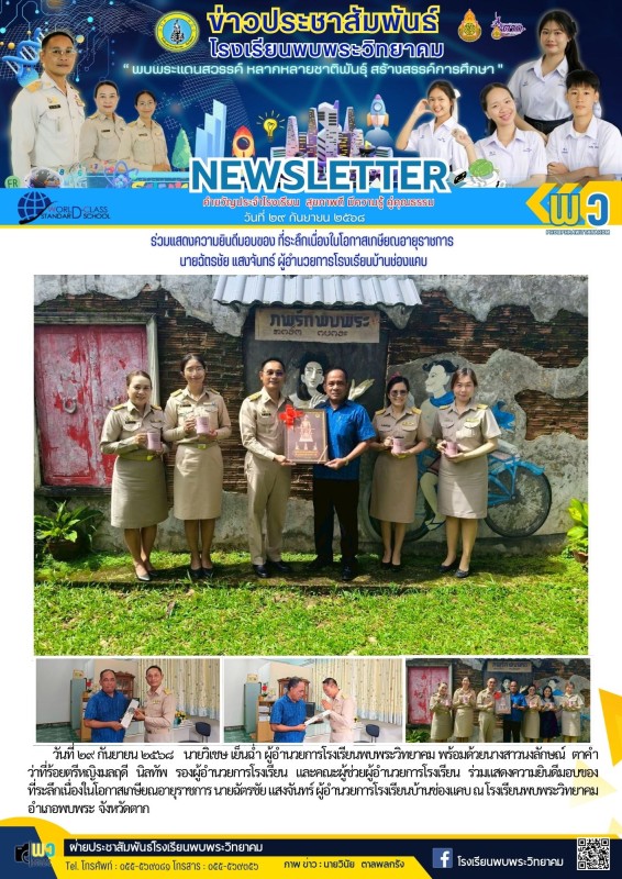 วันที่ ๒๙ กันยายน ๒๕๖๘ นายวิเชษ เย็นฉ่ำ ผู้อำนวยการโรงเรียนพบพระวิทยาคม พร้อมด้วยนางสาวนงลักษณ์ ตาคำ ว่าที่ร้อยตรีหญิงมลฤดี นิลทัพ รองผู้อำนวยการโรงเรียน และคณะผู้ช่วยผู้อำนวยการโรงเรียน ร่วมแสดงความยินดีมอบของที่ระลึกเนื่องในโอกาสเกษียณอายุราชการ นายฉัตรชัย แสงจันทร์ ผู้อำนวยการโรงเรียนบ้านช่องแคบ ณ โรงเรียนพบพระวิทยาคม อำเภอพบพระ จังหวัดตาก |