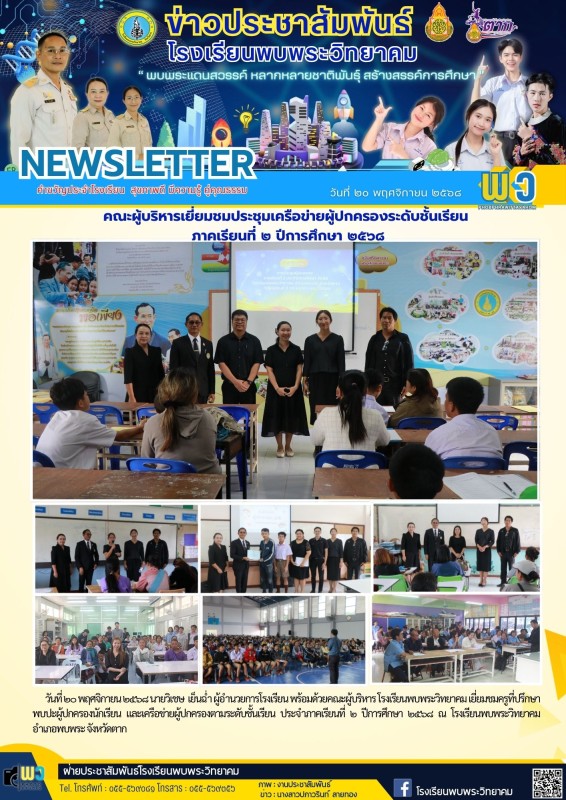วันที่ ๒๐ พฤศจิกายน ๒๕๖๘ นายวิเชษ เย็นฉ่ำ ผู้อำนวยการโรงเรียน พร้อมด้วยคณะผู้บริหาร โรงเรียนพบพระวิทยาคม เยี่ยมชมครูที่ปรึกษาพบปะผู้ปกครองนักเรียน และเครือข่ายผู้ปกครองตามระดับชั้นเรียน ประจำภาคเรียนที่ ๒ ปีการศึกษา ๒๕๖๘ ณ โรงเรียนพบพระวิทยาคม อำเภอพบพระ จังหวัดตาก |