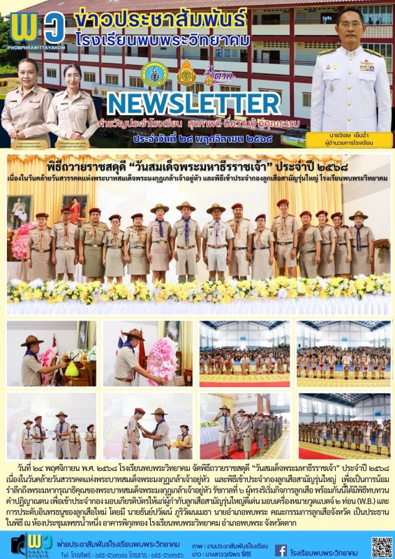วันที่ ๒๔ พฤศจิกายน พ.ศ. ๒๕๖๘ โรงเรียนพบพระวิทยาคม จัดพิธีถวายราชสดุดี “วันสมเด็จพระมหาธีรราชเจ้า” ประจำปี ๒๕๖๘ เนื่องในวันคล้ายวันสวรรคตแห่งพระบาทสมเด็จพระมงกุฎเกล้าเจ้าอยู่หัว และพิธีเข้าประจำกองลูกเสือสามัญรุ่นใหญ่ เพื่อเป็นการน้อมรำลึกถึงพระมหากรุณาธิคุณของพระบาทสมเด็จพระมงกุฎเกล้าเจ้าอยู่หัว รัชกาลที่ ๖ ผู้ทรงริเริ่มกิจการลูกเสือ พร้อมกันนี้ได้มีพิธีทบทวนคำปฏิญาณตน เพื่อเข้าประจำกอง มอบเกียรติบัตรให้แก่ผู้กำกับลูกเสือสามัญรุ่นใหญ่ดีเด่น มอบเครื่องหมายวูดแบดจ์ ๒ ท่อน (W.B.) และการประดับอินทรธนูของลูกเสือใหม่ โดยมี นายธันย์ปวัฒน์ ภูริวัฒนเมธา นายอำเภอพบพระ คณะกรรมการลูกเสือจังหวัด เป็นประธาน ในพิธี ณ ห้องประชุมเพชรน้ำหนึ่ง อาคารพิกุลทอง โรงเรียนพบพระวิทยาคม อำเภอพบพระ จังหวัดตาก |