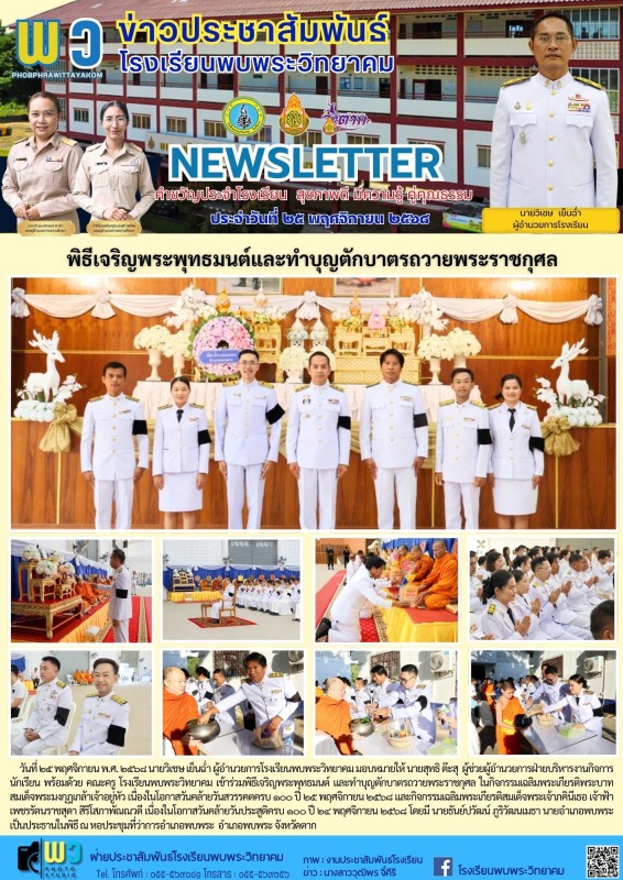 วันที่ ๒๕ พฤศจิกายน พ.ศ. ๒๕๖๘ นายวิเชษ เย็นฉ่ำ ผู้อำนวยการโรงเรียนพบพระวิทยาคม มอบหมายให้ นายสุทธิ ต๊ะสุ ผู้ช่วยผู้อำนวยการฝ่ายบริหารงานกิจการนักเรียน พร้อมด้วย คณะครู โรงเรียนพบพระวิทยาคม เข้าร่วมพิธีเจริญพระพุทธมนต์ และทำบุญตักบาตรถวายพระราชกุศล ในกิจกรรมเฉลิมพระเกียรติพระบาทสมเด็จพระมงกุฎเกล้าเจ้าอยู่หัว เนื่องในโอกาสวันคล้ายวันสวรรคตครบ ๑๐๐ ปี ๒๕ พฤศจิกายน ๒๕๖๘ และกิจกรรมเฉลิมพระเกียรติสมเด็จพระเจ้าภคินีเธอ เจ้าฟ้าเพชรรัตนราชสุดา สิริโสภาพัณณวดี เนื่องในโอกาสวันคล้ายวันประสูติครบ ๑๐๐ ปี ๒๔ พฤศจิกายน ๒๕๖๘ โดยมี นายธันย์ปวัฒน์ ภูริวัฒนเมธา นายอำเภอพบพระ เป็นประธานในพิธี ณ หอประชุมที่ว่าการอำเภอพบพระ อำเภอพบพระ จังหวัดตาก |