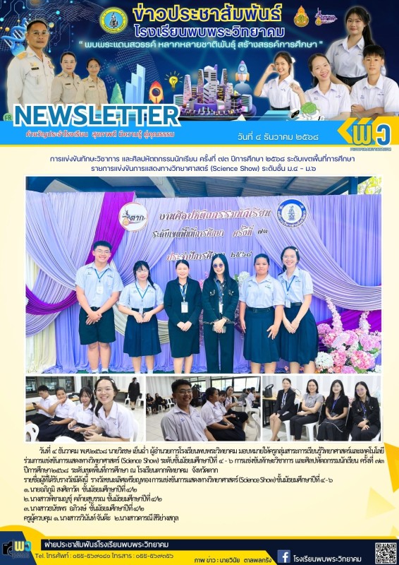 วันที่ ๔ ธันวาคม พ.ศ.๒๕๖๘ นายวิเชษ เย็นฉ่ำ ผู้อํานวยการโรงเรียนพบพระวิทยาคม มอบหมายให้ครูกลุ่มสาระการเรียนรู้วิทยาศาสตร์และเทคโนโลยี ร่วมการแข่งขันการแสดงทางวิทยาศาสตร์ (Science Show) ระดับชั้นมัธยมศึกษาปีที่ ๔ - ๖ การแข่งขันทักษะวิชาการ และศิลปหัตถกรรมนักเรียน ครั้งที่ ๗๓ ปีการศึกษา ๒๕๖๘ ระดับเขตพื้นที่การศึกษา ณ โรงเรียนตากพิทยาคม จังหวัดตาก