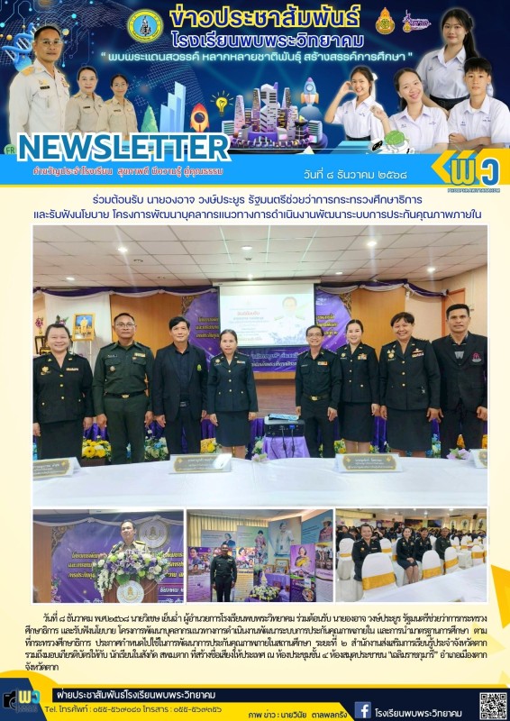 วันที่ ๘ ธันวาคม พ.ศ.๒๕๖๘ นายวิเชษ เย็นฉ่ำ ผู้อํานวยการโรงเรียนพบพระวิทยาคม ร่วมต้อนรับ นายองอาจ วงษ์ประยูร รัฐมนตรีช่วยว่าการกระทรวงศึกษาธิการ และรับฟังนโยบาย โครงการพัฒนาบุคลากรแนวทางการดำเนินงานพัฒนาระบบการประกันคุณภาพภายใน และการนำมาตรฐานการศึกษา ตามที่กระทรวงศึกษาธิการ ประกาศกำหนดไปใช้ในการพัฒนาการประกันคุณภาพภายในสถานศึกษา ระยะที่ ๒ สำนักงานส่งเสริมการเรียนรู้ประจำจังหวัดตาก รวมถึงมอบเกียรติบัตรให้กับ นักเรียนในสังกัด สพม.ตาก ที่สร้างชื่อเสียงให้ประเทศ ณ ห้องประชุมชั้น ๔ ห้องสมุดประชาชน "เฉลิมราชกุมารี” อำเภอเมืองตาก จังหวัดตาก |