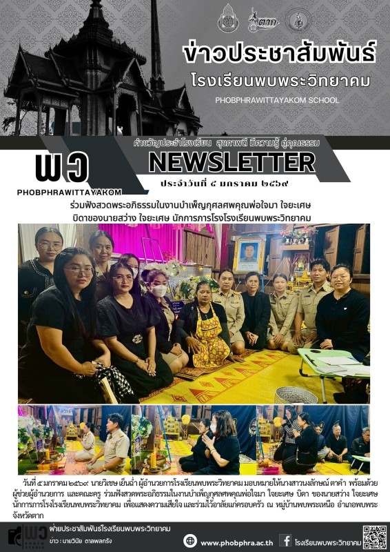 วันที่ ๕ มกราคม ๒๕๖๙ นายวิเชษ เย็นฉ่ำ ผู้อำนวยการโรงเรียนพบพระวิทยาคม มอบหมายให้นางสาวนงลักษณ์ ตาคำ พร้อมด้วยผู้ช่วยผู้อำนวยการ และคณะครู ร่วมฟังสวดพระอภิธรรมในงานบําเพ็ญกุศลศพคุณพ่อใจมา ใจยะเศษ บิดา ของนายสว่าง ใจยะเศษ นักการภารโรงโรงเรียนพบพระวิทยาคม เพื่อแสดงความเสียใจ และร่วมไว้อาลัยแก่ครอบครัว ณ หมู่บ้านพบพระเหนือ อำเภอพบพระ จังหวัดตาก |