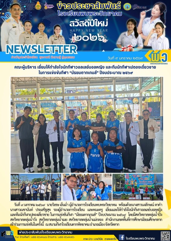 วันที่ ๙ มกราคม ๒๕๖๙ นายวิเชษ เย็นฉ่ำ ผู้อำนวยการโรงเรียนพบพระวิทยาคม พร้อมด้วยนางสาวนงลักษณ์ ตาคำ นางสาวณชานันท์ ประเสริฐสุข รองผู้อำนวยการโรงเรียน และคณะครู เยี่ยมและให้กำลังใจนักกีฬาวอลเลย์บอลหญิง และทีมนักกีฬาเปตองเดี่ยวชาย ในการแข่งขันกีฬา “มัธยมตากเกมส์” ปีงบประมาณ ๒๕๖๙ โดยมีสหวิทยาเขตลุ่มน้ำปิง สหวิทยาเขตลุ่มน้ำวัง สหวิทยาเขตลุ่มน้ำเมย สหวิทยาเขตลุ่มน้ำแม่กลอง สำนักงานเขตพื้นที่การศึกษามัธยมศึกษาตากเข้าร่วมการแข่งขันในครั้งนี้ ณ สนามกีฬาโรงเรียนตากพิทยาคม อำเภอเมืองตาก จังหวัดตาก |