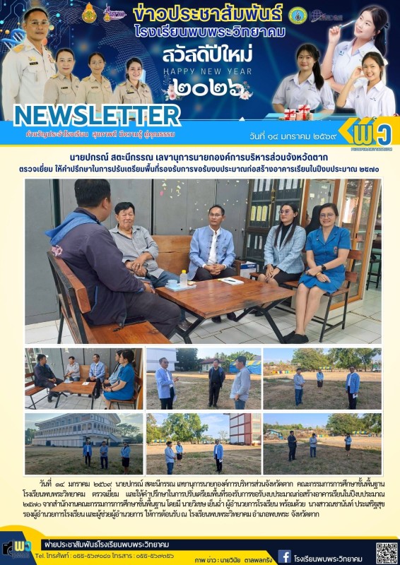 วันที่ ๑๔ มกราคม ๒๕๖๙ นายปกรณ์ สตะนีกรรณ เลขานุการนายกองค์การบริหารส่วนจังหวัดตาก คณะกรรมการการศึกษาขั้นพื้นฐานโรงเรียนพบพระวิทยาคม ตรวจเยี่ยม และให้คำปรึกษาในการปรับเตรียมพื้นที่รองรับการขอรับงบประมาณก่อสร้างอาคารเรียนในปีงบประมาณ ๒๕๗๐ จากสำนักงานคณะกรรมการการศึกษาขั้นพื้นฐาน โดยมี นายวิเชษ เย็นฉ่ำ ผู้อำนวยการโรงเรียน พร้อมด้วย นางสาวณชานันท์ ประเสริฐสุข รองผู้อำนวยการโรงเรียน และผู้ช่วยผู้อำนวยการ ให้การต้อนรับ ณ โรงเรียนพบพระวิทยาคม อำเภอพบพระ จังหวัดตาก |
