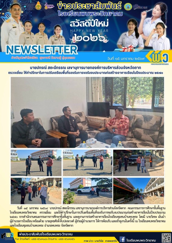วันที่ ๑๕ มกราคม ๒๕๖๙ นายปกรณ์ สตะนีกรรณ เลขานุการนายกองค์การบริหารส่วนจังหวัดตาก คณะกรรมการการศึกษาขั้นพื้นฐานโรงเรียนพบพระวิทยาคม ตรวจเยี่ยม และให้คำปรึกษาในการปรับเตรียมพื้นที่รองรับการขอรับงบประมาณก่อสร้างอาคารเรียนในปีงบประมาณ ๒๕๗๐ จากสำนักงานคณะกรรมการการศึกษาขั้นพื้นฐาน และดูงานการก่อสร้างอาคารเรียนโรงเรียนชุมชนบ้านพบพระ โดยมี นายวิเชษ เย็นฉ่ำ ผู้อำนวยการโรงเรียน พร้อมด้วย นายยุทธศักดิ์ ติ๊บปะละวงศ์ ผู้ช่วยผู้อำนวยการ ให้การต้อนรับ และเข้าดูงานในครั้งนี้ ณ โรงเรียนพบพระวิทยาคม และโรงเรียนชุมชนบ้านพบพระ อำเภอพบพระ จังหวัดตาก |