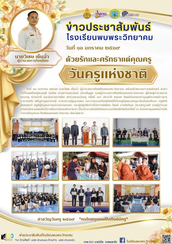 วันที่ ๑๖ มกราคม ๒๕๖๙ นายวิเชษ เย็นฉ่ำ ผู้อำนวยการโรงเรียนพบพระวิทยาคม พร้อมด้วยนางสาวนงลักษณ์ ตาคำ ว่าที่ร้อยตรีหญิงมลฤดี นิลทัพ นางสาวณชานันท์ ประเสริฐสุข รองผู้อำนวยการโรงเรียนพบพระวิทยาคม ผู้ช่วยผู้อำนวยการ คณะครู เจ้าหน้าที่ และนักการภารโรง เข้าร่วมงานวันครู ครั้งที่ ๗๐ ประจำปี ๒๕๖๙ โดยมีกิจกรรมทำบุญตักบาตรข้าวสารอาหารแห้ง พิธีบูชาบูรพาจารย์ การกล่าวปฏิญาณตน และการมอบเกียรติบัตรให้กับครูดีสุดยอดครูระดับมัธยมศึกษา ครูดีศรีมัธยมตาก ครูดีผู้มีอุดมการณ์อำเภอพบพระ และผู้ปฏิบัติหน้าที่นักการดีเยี่ยม โดยมี นางจิรโรจน์ จิระเจริญวงศ์ รองผู้อำนวยการสำนักงานเขตพื้นที่การศึกษามัธยมศึกษาตาก เป็นประธานในพิธีเปิดและมอบเกียรติบัตรในครั้งนี้ ณ ห้องประชุมเพชรน้ำหนึ่ง อาคารพิกุลทอง โรงเรียนพบพระวิทยาคม จังหวัดตาก |