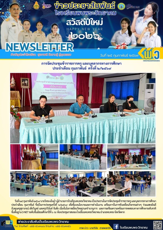 วันที่ ๒๕ กุมภาพันธ์ ๒๕๖๙ นายวิเชษ เย็นฉ่ำ ผู้อำนวยการโรงเรียนพบพระวิทยาคม เป็นประธานในการจัดประชุมข้าราชการครู และบุคลากรทางการศึกษา ประจำเดือน กุมภาพันธ์ ซึ่งเป็นการประชุมครั้งที่ ๒/๒๕๖๙ เพื่อชี้แจงนโยบายและการดำเนินงาน เตรียมการในการขับเคลื่อนกิจกรรมต่างๆ ร่วมแสดงยินดี กับคุณครูสุภาภรณ์ เตียวิบูลย์ และครูรวินันท์ จันต๊ะ เนื่องในโอกาสเลื่อนวิทยฐานะชำนาญการ และการเตรียมความพร้อมการทดสอบทางการศึกษาระดับชาติขั้นพื้นฐาน O-NET ระดับชั้นมัธยมศึกษาปีที่ ๖ ณ ห้องประชุมกาสะลอง โรงเรียนพบพระวิทยาคม อำเภอพบพระ จังหวัดตาก |