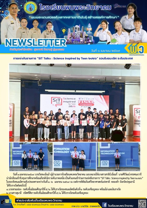 วันที่ ๑ เมษายน ๒๕๖๙ นายวิเชษ เย็นฉ่ำ ผู้อำนวยการโรงเรียนพบพระวิทยาคม มอบหมายให้นางสาวสาลินี เอี่ยมกี่ นายศิริวัฒน์ ทรรศนะวารี นำนักเรียนเข้ารับทุนการศึกษาพร้อมเกียรติบัตร ระดับภาคเหนือ เป็นตัวแทนเข้าร่วมการแข่งขันรายการ “SiT Talks : Science inspired by Teen ๒๐๒๖” ในรอบชิงชนะเลิศ ระดับประเทศ ระหว่างวันที่ ๑ - ๒ เมษายน ๒๕๖๙ ณ องค์การพิพิธภัณฑ์วิทยาศาสตร์แห่งชาติ คลองห้า จังหวัดปทุมธานี