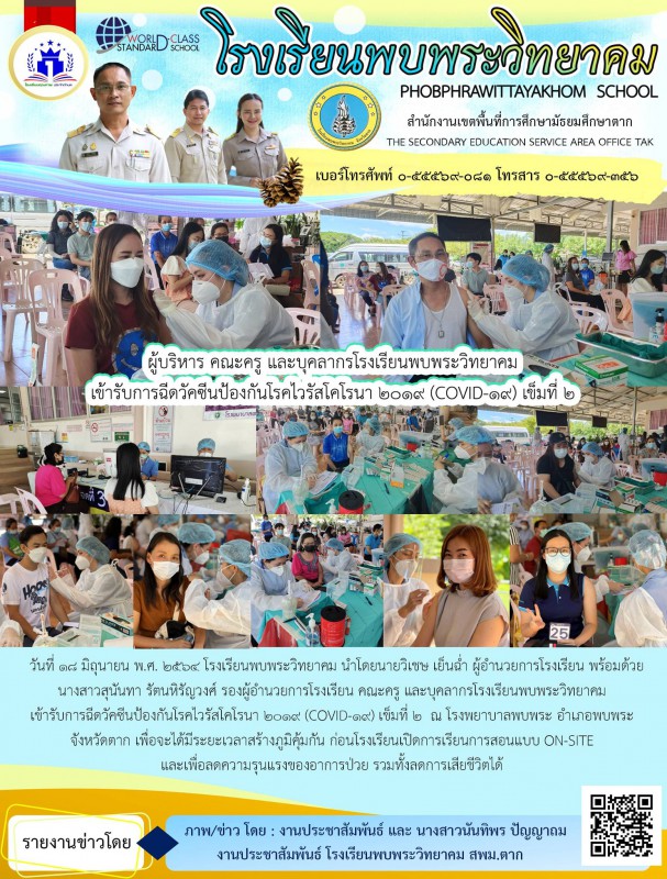 18 มิ.ย. 64 ผู้บริหาร คณะครู และบุคลากรโรงเรียนพบพระวิทยาคม เข้ารับการฉีดวัคซีนป้องกันโรคไวรัสโคโรนา 2019 (COVID-19) เข็มที่ 2