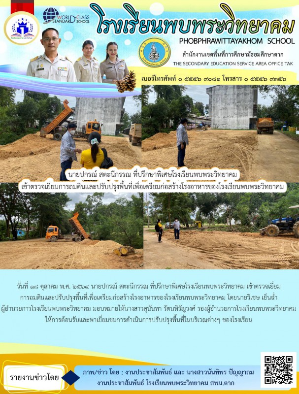 18 ต.ค. 64 นายปกรณ์ สตะนีกรรณ ที่ปรึกษาพิเศษโรงเรียนพบพระวิทยาคม เข้าตรวจเยี่ยมการถมดินและปรับปรุงพื้นที่เพื่อเตรียมก่อสร้างโรงอาหารของโรงเรียนพบพระวิทยาคม