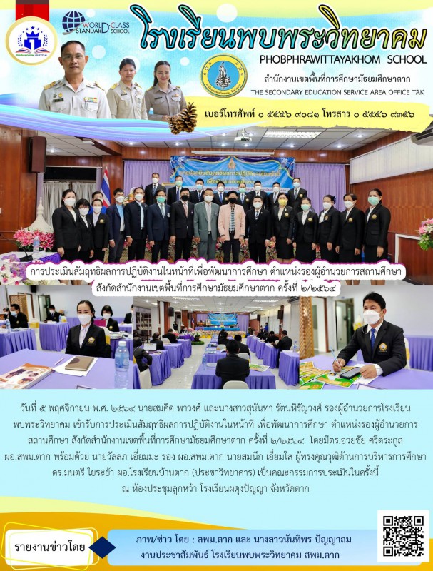 วันที่ 5 พฤศจิกายน พ.ศ. 2564 นายสมคิด พาวงศ์ และนางสาวสุนันทา รัตนหิรัญวงศ์ รองผู้อำนวยการโรงเรียนพบพระวิทยาคม เข้ารับการประเมินสัมฤทธิผลการปฏิบัติงานในหน้าที่ เพื่อพัฒนาการศึกษา ตำแหน่งรองผู้อำนวยการสถานศึกษา สังกัดสำนักงานเขตพื้นที่การศึกษามัธยมศึกษาตาก ครั้งที่ 2/2564 โดยมีดร.อวยชัย ศรีตระกูล ผอ.สพม.ตาก พร้อมด้วย นายวัลลภ เอี่ยมมะ รอง ผอ.สพม.ตาก นายสมนึก เอี่ยมใส ผู้ทรงคุณวุฒิด้านการบริหารการศึกษา ดร.มนตรี ใยระย้า ผอ.โรงเรียนบ้านตาก (ประชาวิทยาคาร) เป็นคณะกรรมการประเมินในครั้งนี้ ณ ห้องประชุมลูกหว้า โรงเรียนผดุงปัญญา จังหวัดตาก