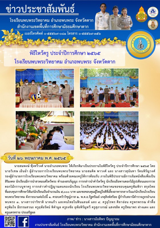 นายสมพงษ์ ฟุ้งทวีวงศ์ นายอำเภอพบพระ ให้เกียรติมาเป็นประธานในพิธีไหว้ครู ประจำปีการศึกษา 2565 โดยนายวิเชษ เย็นฉ่ำ ผู้อำนวยการโรงเรียนพบพระวิทยาคม นายสมคิด พาวงศ์ และ นางสาวสุนันทา รัตนหิรัญวงศ์ รองผู้อำนวยการโรงเรียนพบพระวิทยาคม พร้อมด้วยคณะครูให้การต้อนรับ ภายในพิธีประธานมีการเจิมหนังสือเพื่อเป็นสิริมงคล นักเรียนมีการนำสวดมนต์ไหว้พระ ทำนองสรภัญญะ การกล่าวนำคำไหว้ครู นักเรียนถือพานดอกไม้ธูปเทียนและกรวยดอกไม้กราบบูชาครู การกล่าวคำปฏิญาณตนของนักเรียน โรงเรียนพบพระวิทยาคมขอขอบคุณครูพิมพิรา สกุลไทย ที่มอบทุนการศึกษาให้แก่นักเรียนเป็นจำนวนเงิน 5,000 บาท และขอขอบคุณผู้ใหญ่ใจดีที่เลี้ยงอาหารกลางวันแก่นักเรียนโรงเรียนพบพระวิทยาคม ดังรายนามต่อไปนี้ 1. ครอบครัววิชุญ์ภาส 2. พ.ต.อ.รัฐศรัณย์ เกตุสิงห์สร้อย ผู้กำกับสถานีตำรวจภูธรอำเภอพบพระ 3. นางสาวปาริชาติ นาคแก้ว และคนไทยในฟินแลนด์ และ 4. ครูอุไรพร ศิลาอ่อน ครูพรพรรณ คำตื้อ ครูพิมใจ มีธรรมสวนะ ครูฤทัยรัตน์ ทิคำมูล ครูธงชัย อุทัยหิรัญทวี ครูสุภาภรณ์ แสงชลิต ครูปัทมาพร ฝางแดง และครูเนตรทราย ประเสริฐผล |