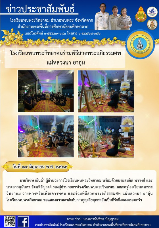 นายวิเชษ เย็นฉ่ำ ผู้อำนวยการโรงเรียนพบพระวิทยาคม พร้อมด้วยนายสมคิด พาวงศ์ และนางสาวสุนันทา รัตนหิรัญวงศ์ รองผู้อำนวยการโรงเรียนพบพระวิทยาคม คณะครูโรงเรียนพบพระวิทยาคม วางพวงหรีดเพื่อเคารพศพ และร่วมพิธีสวดพระอภิธรรมศพ แม่หลวงนา ยาอุ่น โรงเรียนพบพระวิทยาคม ขอแสดงความอาลัยกับการสูญเสียบุคคลอันเป็นที่รักยิ่งของครอบครัว |