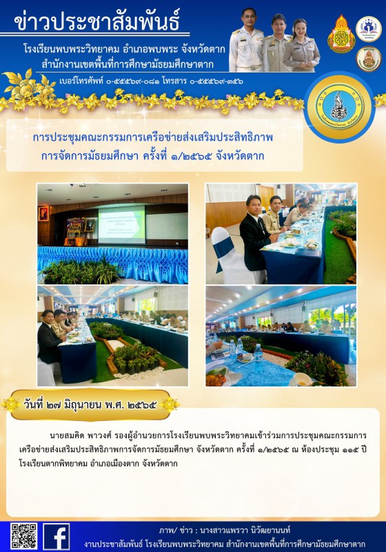 นายสมคิด พาวงศ์ รองผู้อำนวยการโรงเรียนพบพระวิทยาคมเข้าร่วมการประชุมคณะกรรมการเครือข่ายส่งเสริมประสิทธิภาพการจัดการมัธยมศึกษา จังหวัดตาก ครั้งที่ 1/2565 ณ ห้องประชุม 115 ปี โรงเรียนตากพิทยาคม อำเภอเมืองตาก จังหวัดตาก |