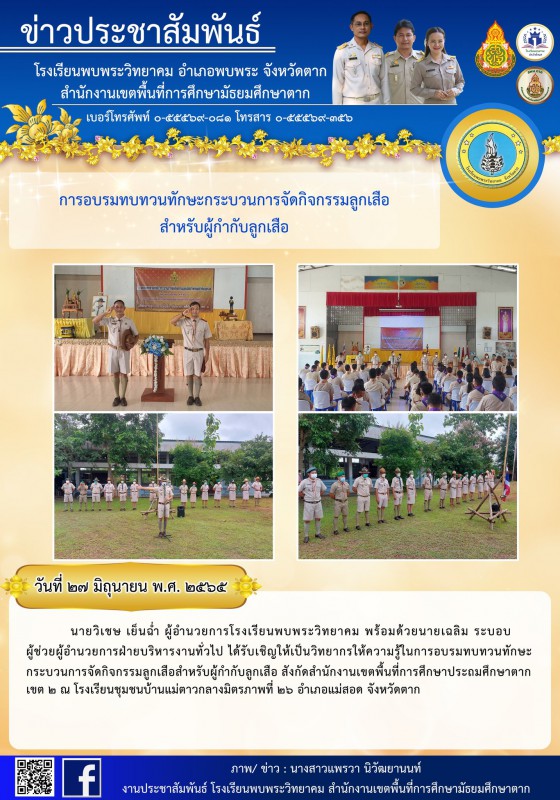 นายวิเชษ เย็นฉ่ำ ผู้อำนวยการโรงเรียนพบพระวิทยาคม พร้อมด้วยนายเฉลิม ระบอบ ผู้ช่วยผู้อำนวยการฝ่ายบริหารงานทั่วไป ได้รับเชิญให้เป็นวิทยากรให้ความรู้ในการอบรมทบทวนทักษะกระบวนการจัดกิจกรรมลูกเสือสำหรับผู้กำกับลูกเสือ สังกัดสำนักงานเขตพื้นที่การศึกษาประถมศึกษาตาก เขต 2 ณ โรงเรียนชุมชนบ้านแม่ตาวกลางมิตรภาพที่ 26 อำเภอแม่สอด จังหวัดตาก