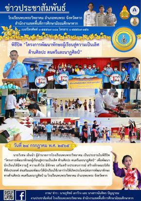 นายวิเชษ เย็นฉ่ำ ผู้อำนวยการโรงเรียนพบพระวิทยาคม เป็นประธานในพิธีปิด “โครงการพัฒนาทักษะผู้เรียนสู่ความเป็นเลิศ ด้านศิลปะ ดนตรีและนาฏศิลป์” เพื่อพัฒนานักเรียนให้มีความรู้ ความเข้าใจ มีทักษะ เสริมสร้างประสบการณ์ สร้างลักษณะนิสัยที่พึงประสงค์ ส่งเสริมและพัฒนาให้นักเรียนใช้เวลาว่างให้เกิดประโยชน์ต่อการพัฒนาทักษะทางด้านศิลปะ ดนตรีและนาฏศิลป์ ณ โรงเรียนพบพระวิทยาคม อำเภอพบพระ จังหวัดตาก |