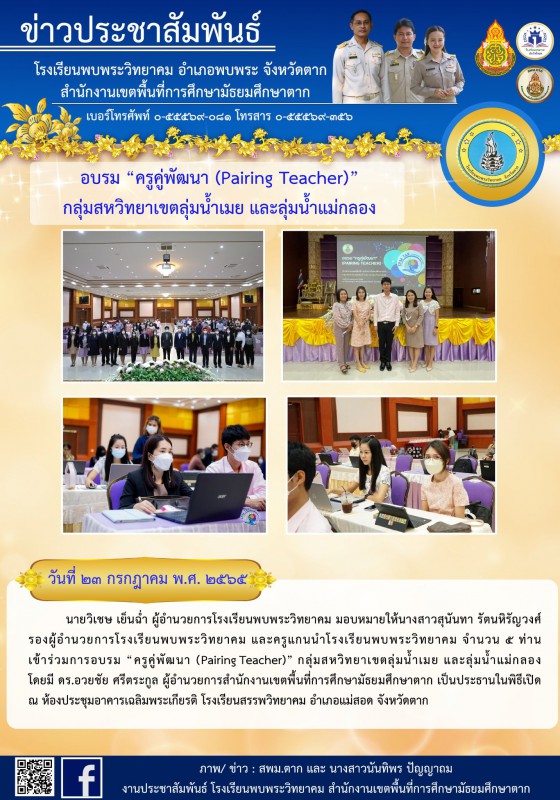 นายวิเชษ เย็นฉ่ำ ผู้อำนวยการโรงเรียนพบพระวิทยาคม มอบหมายให้นางสาวสุนันทา รัตนหิรัญวงศ์ รองผู้อำนวยการโรงเรียนพบพระวิทยาคม และครูแกนนำโรงเรียนพบพระวิทยาคม จำนวน 5 ท่าน เข้าร่วมการอบรม “ครูคู่พัฒนา (Pairing.Teacher)” กลุ่มสหวิทยาเขตลุ่มน้ำเมย และลุ่มน้ำแม่กลอง โดยมี ดร.อวยชัย ศรีตระกูล ผู้อำนวยการสำนักงานเขตพื้นที่การศึกษามัธยมศึกษาตาก เป็นประธานในพิธีเปิด ณ ห้องประชุมอาคารเฉลิมพระเกียรติ โรงเรียนสรรพวิทยาคม อำเภอแม่สอด จังหวัดตาก |