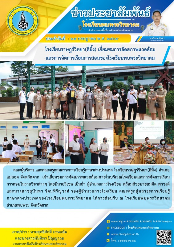 คณะผู้บริหาร และคณะครูกลุ่มสาระการเรียนรู้ภาษาต่างประเทศ โรงเรียนราษฎร์วิทยา(ตี่มิ้ง) อำเภอแม่สอด จังหวัดตาก เข้าเยี่ยมชมการจัดสภาพแวดล้อมภายในบริเวณโรงเรียนและการจัดการเรียนการสอนในรายวิชาต่างๆ โดยมีนายวิเชษ เย็นฉ่ำ ผู้อำนวยการโรงเรียน พร้อมด้วยนายสมคิด พาวงศ์ และนางสาวสุนันทา รัตนหิรัญวงศ์ รองผู้อำนวยการโรงเรียน คณะครูกลุ่มสาระการเรียนรู้ภาษาต่างประเทศของโรงเรียนพบพระวิทยาคม ให้การต้อนรับ ณ โรงเรียนพบพระวิทยาคม อำเภอพบพระ จังหวัดตาก |