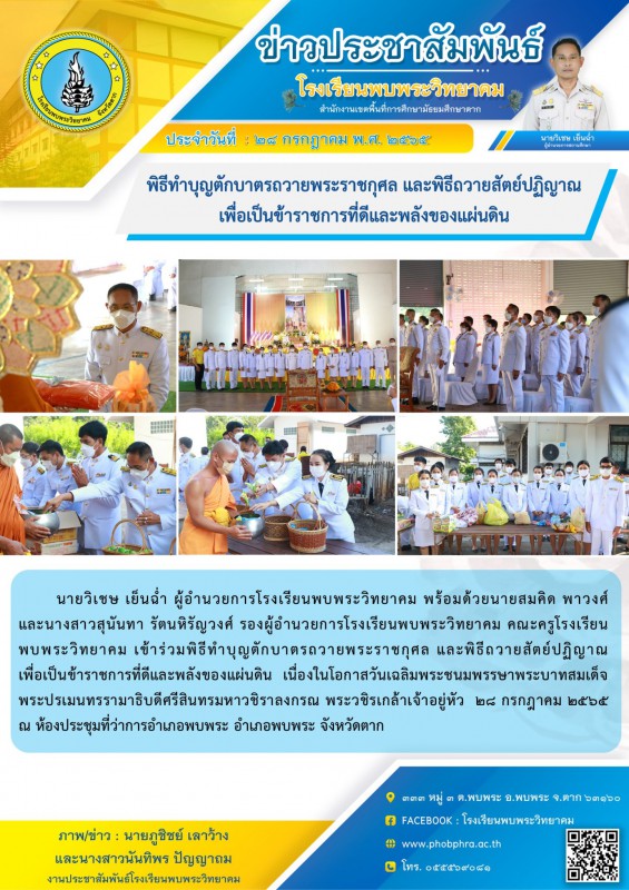 นายวิเชษ เย็นฉ่ำ ผู้อำนวยการโรงเรียนพบพระวิทยาคม พร้อมด้วยนายสมคิด พาวงศ์ และนางสาวสุนันทา รัตนหิรัญวงศ์ รองผู้อำนวยการโรงเรียนพบพระวิทยาคม คณะครูโรงเรียนพบพระวิทยาคม เข้าร่วมพิธีทำบุญตักบาตรถวายพระราชกุศล และพิธีถวายสัตย์ปฏิญาณเพื่อเป็นข้าราชการที่ดีและพลังของแผ่นดิน เนื่องในโอกาสวันเฉลิมพระชนมพรรษาพระบาทสมเด็จพระปรเมนทรรามาธิบดีศรีสินทรมหาวชิราลงกรณ พระวชิรเกล้าเจ้าอยู่หัว 28 กรกฎาคม 2565 ณ ห้องประชุมที่ว่าการอำเภอพบพระ อำเภอพบพระ จังหวัดตาก |