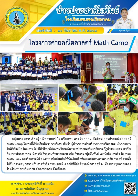 กลุ่มสาระการเรียนรู้คณิตศาสตร์ โรงเรียนพบพระวิทยาคม จัดโครงการค่ายคณิตศาสตร์ Math Camp ในการนี้ได้รับเกียรติจาก นายวิเชษ เย็นฉ่ำ ผู้อำนวยการโรงเรียนพบพระวิทยาคม เป็นประธานในพิธีเปิด-ปิด โครงการ โดยมีนักศึกษาโปรแกรมวิชาคณิตศาสตร์ จากมหาวิทยาลัยราชภัฏกำแพงเพชร มาเป็นวิทยากรในการอบรม มีการจัดกิจกรรมที่หลากหลาย เช่น กิจกรรมกลุ่มสัมพันธ์ เทคนิคคิดเลขเร็ว กิจกรรม Math Rally และกิจกรรมพิชิต Math เพื่อส่งเสริมให้นักเรียนฝึกทักษะกระบวนการทางคณิตศาสตร์ รวมทั้งได้รับความสนุกสนานกับการทำกิจกรรมและมีเจตคติที่ดีต่อวิชาคณิตศาสตร์ ณ ห้องประชุมกาสะลอง โรงเรียนพบพระวิทยาคม อำเภอพบพระ จังหวัดตาก |