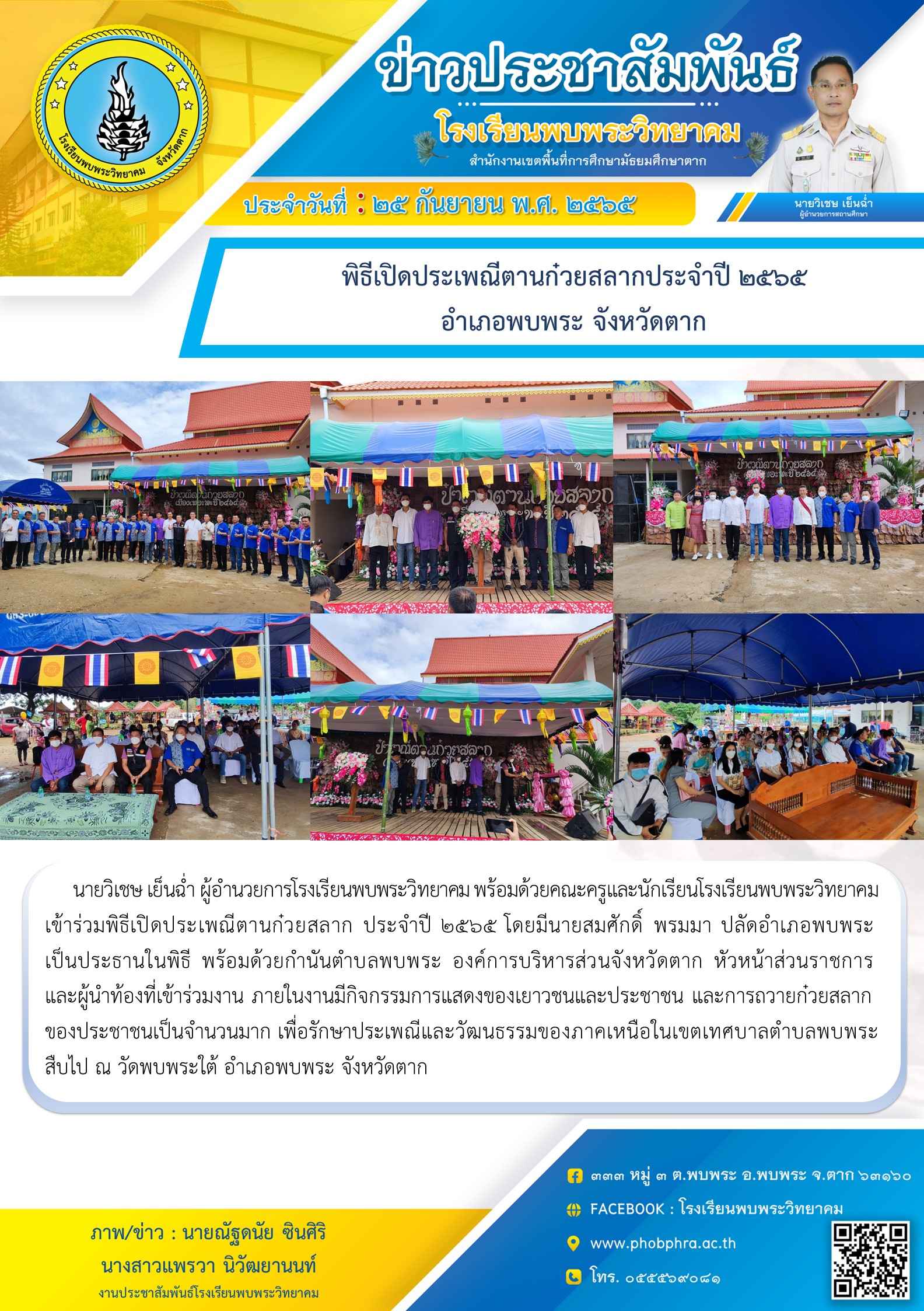 นายวิเชษ เย็นฉ่ำ ผู้อำนวยการโรงเรียนพบพระวิทยาคม พร้อมด้วยคณะครูและนักเรียนโรงเรียนพบพระวิทยาคม เข้าร่วมพิธีเปิดประเพณีตานก๋วยสลาก ประจำปี 2565 โดยมีนายสมศักดิ์ พรมมา ปลัดอำเภอพบพระ เป็นประธานในพิธี พร้อมด้วยกำนันตำบลพบพระ องค์การบริหารส่วนจังหวัดตาก หัวหน้าส่วนราชการ และผู้นำท้องที่เข้าร่วมงาน ภายในงานมีกิจกรรมการแสดงของเยาวชนและประชาชน และการถวายก๋วยสลาก ของประชาชนเป็นจำนวนมาก เพื่อรักษาประเพณีและวัฒนธรรมของภาคเหนือในเขตเทศบาลตำบลพบพระสืบไป ณ วัดพบพระใต้ อำเภอพบพระ จังหวัดตาก |