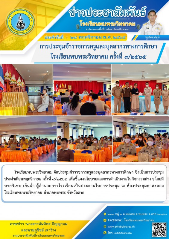 โรงเรียนพบพระวิทยาคม จัดประชุมข้าราชการครูและบุคลากรทางการศึกษา ซึ่งเป็นการประชุมประจำเดือนพฤศจิกายน ครั้งที่ 9/2565 เพื่อชี้แจงนโยบายและการดำเนินงานในกิจกรรมต่างๆ โดยมีนายวิเชษ เย็นฉ่ำ ผู้อำนวยการโรงเรียนเป็นประธานในการประชุม ณ ห้องประชุมกาสะลอง โรงเรียนพบพระวิทยาคม อำเภอพบพระ จังหวัดตาก |