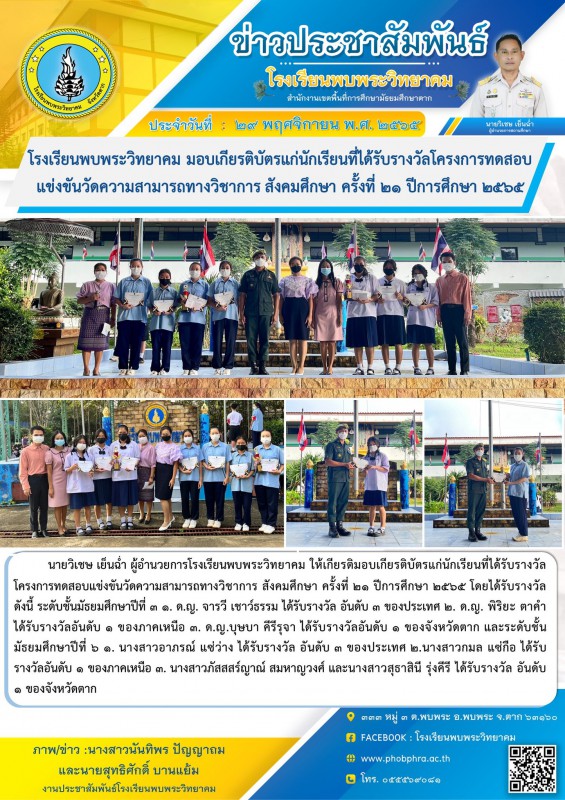 นายวิเชษ เย็นฉ่ำ ผู้อำนวยการโรงเรียนพบพระวิทยาคม ให้เกียรติมอบเกียรติบัตรแก่นักเรียนที่ได้รับรางวัลโครงการทดสอบแข่งขันวัดความสามารถทางวิชาการ สังคมศึกษา ครั้งที่ 21 ปีการศึกษา 2565 โดยได้รับรางวัลดังนี้ ระดับชั้นมัธยมศึกษาปีที่ 3 1. ด.ญ. จารวี เชาว์ธรรม ได้รับรางวัล อันดับ 3 ของประเทศ 2. ด.ญ. พิริยะ ตาคำ ได้รับรางวัลอันดับ 1 ของภาคเหนือ 3. ด.ญ.บุษบา คีรีรุจา ได้รับรางวัลอันดับ 1 ของจังหวัดตาก และระดับชั้นมัธยมศึกษาปีที่ 6 1. นางสาวอาภรณ์ แซ่ว่าง ได้รับรางวัล อันดับ 3 ของประเทศ 2.นางสาวกมล แซ่กือ ได้รับรางวัลอันดับ 1 ของภาคเหนือ 3. นางสาวภัสสสร์ญาณ์ สมหาญวงศ์ และนางสาวสุธาสินี รุ่งคีรี ได้รับรางวัล อันดับ 1 ของจังหวัดตาก |