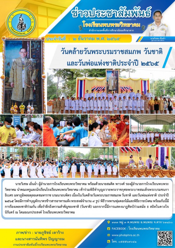 นายวิเชษ เย็นฉ่ำ ผู้อำนวยการโรงเรียนพบพระวิทยาคม พร้อมด้วยนายสมคิด พาวงศ์ รองผู้อำนวยการโรงเรียนพบพระวิทยาคม นำคณะครูและนักเรียนโรงเรียนพบพระวิทยาคม เข้าร่วมพิธีทำบุญถวายพระราชกุศลพระบาทสมเด็จพระบรมชนกาธิเบศร มหาภูมิพลอดุลยเดชมหาราช บรมนาถบพิตร เนื่องในวันคล้ายวันพระบรมราชสมภพ วันชาติ และวันพ่อแห่งชาติ ประจำปี 2565 โดยมีการทำบุญตักบาตรข้าวสารอาหารแห้ง พระสงฆ์จำนวน 9 รูป พิธีวางพานพุ่มดอกไม้และพิธีถวายบังคม พร้อมกันนี้มีการร้องเพลงชาติร่วมกัน เพื่อรำลึกถึงความสำคัญของชาติ (วันชาติ) นอกจากนี้มีการแสดงนาฏศิลป์ร่วมสมัย ธ สถิตในดวงใจนิรันดร์ ณ โดมอเนกประสงค์ โรงเรียนพบพระวิทยาคม |