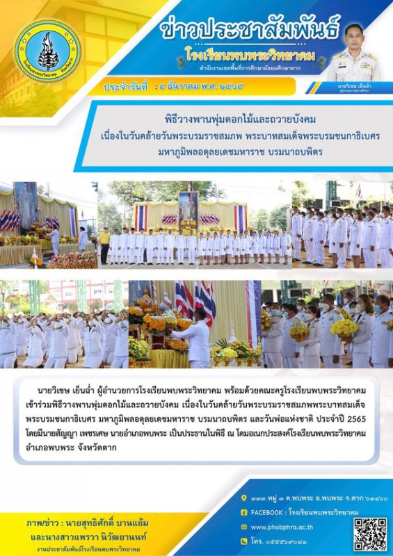 นายวิเชษ เย็นฉ่ำ ผู้อำนวยการโรงเรียนพบพระวิทยาคม พร้อมด้วยคณะครูโรงเรียนพบพระวิทยาคม เข้าร่วมพิธีวางพานพุ่มดอกไม้และถวายบังคม เนื่องในวันคล้ายวันพระบรมราชสมภพพระบาทสมเด็จพระบรมชนกาธิเบศร มหาภูมิพลอดุลยเดชมหาราช บรมนาถบพิตร และวันพ่อแห่งชาติ ประจำปี 2565 โดยมีนายสัญญา เพชรเศษ นายอำเภอพบพระ เป็นประธานในพิธี ณ โดมอเนกประสงค์โรงเรียนพบพระวิทยาคม อำเภอพบพระ จังหวัดตาก |