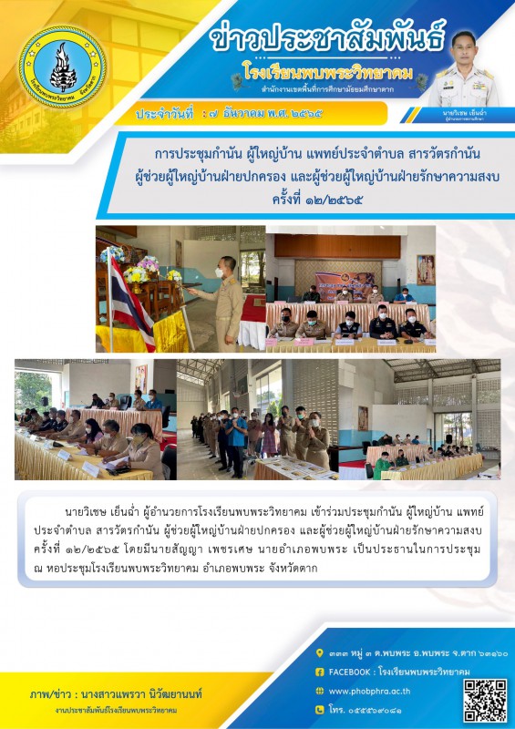 นายวิเชษ เย็นฉ่ำ ผู้อำนวยการโรงเรียนพบพระวิทยาคม เข้าร่วมประชุมกำนัน ผู้ใหญ่บ้าน แพทย์ประจำตำบล สารวัตรกำนัน ผู้ช่วยผู้ใหญ่บ้านฝ่ายปกครอง และผู้ช่วยผู้ใหญ่บ้านฝ่ายรักษาความสงบ ครั้งที่ ๑๒/๒๕๖๕ โดยมีนายสัญญา เพชรเศษ นายอำเภอพบพระ เป็นประธานในการประชุม ณ หอประชุมโรงเรียนพบพระวิทยาคม อำเภอพบพระ จังหวัดตาก