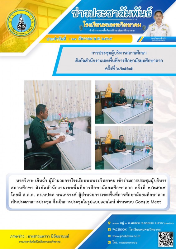 นายวิเชษ เย็นฉ่ำ ผู้อำนวยการโรงเรียนพบพระวิทยาคม เข้าร่วมการประชุมผู้บริหารสถานศึกษา สังกัดสำนักงานเขตพื้นที่การศึกษามัธยมศึกษาตาก ครั้งที่ ๖/๒๕๖๕ โดยมี ส.ต.ต. ดร.นปดล นพเคราะห์ ผู้อำนวยการเขตพื้นที่การศึกษามัธยมศึกษาตาก เป็นประธานการประชุม ซึ่งเป็นการประชุมในรูปแบบออนไลน์ ผ่านระบบ Google Meet |