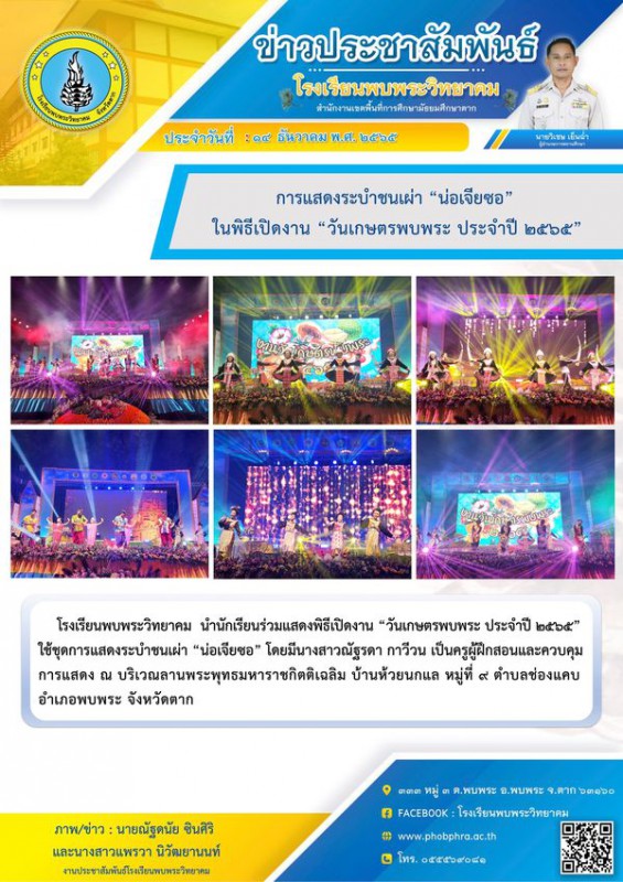 โรงเรียนพบพระวิทยาคม นำนักเรียนร่วมแสดงพิธีเปิดงาน “วันเกษตรพบพระ ประจำปี ๒๕๖๕” ใช้ชุดการแสดงระบำชนเผ่า “น่อเจียซอ” โดยมีนางสาวณัฐรดา กาวีวน เป็นครูผู้ฝึกสอนและควบคุมการแสดง ณ บริเวณลานพระพุทธมหาราชกิตติเฉลิม บ้านห้วยนกแล หมู่ที่ ๙ ตำบลช่องแคบ อำเภอพบพระ จังหวัดตาก |