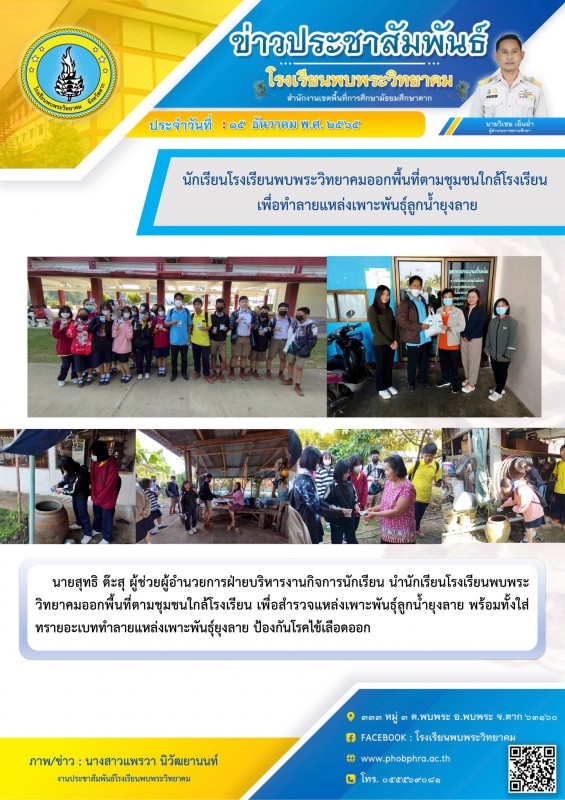 นายสุทธิ ต๊ะสุ ผู้ช่วยผู้อำนวยการฝ่ายบริหารงานกิจการนักเรียน นำนักเรียนโรงเรียนพบพระวิทยาคมออกพื้นที่ตามชุมชนใกล้โรงเรียน เพื่อสำรวจแหล่งเพาะพันธุ์ลูกน้ำยุงลาย พร้อมทั้งใส่ทรายอะเบททำลายแหล่งเพาะพันธุ์ยุงลาย ป้องกันโรคไข้เลือดออก |