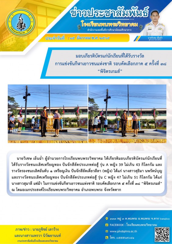 นายวิเชษ เย็นฉ่ำ ผู้อำนวยการโรงเรียนพบพระวิทยาคม ให้เกียรติมอบเกียรติบัตรแก่นักเรียนที่ได้รับรางวัลชนะเลิศเหรียญทอง ปันจักสีลัตประเภทต่อสู้ รุ่น A หญิง 39 ไม่เกิน 43 กิโลกรัม และรางวัลรองชนะเลิศอันดับ ๑ เหรียญเงิน ปันจักสีลัตเดี่ยวลีลา (หญิง) ได้แก่ นางสาวสุธิมา นพรัตน์บุญ และรางวัลชนะเลิศเหรียญทอง ปันจักสีลัตประเภทต่อสู้ รุ่น C หญิง 47 ไม่เกิน 51 กิโลกรัม ได้แก่ นางสาวสุมาลี แซ่ม้า ในการแข่งขันกีฬาเยาวชนแห่งชาติ รอบคัดเลือกภาค ๕ ครั้งที่ ๓๘ “พิจิตรเกมส์” ณ โดมอเนกประสงค์โรงเรียนพบพระวิทยาคม อำเภอพบพระ จังหวัดตาก |