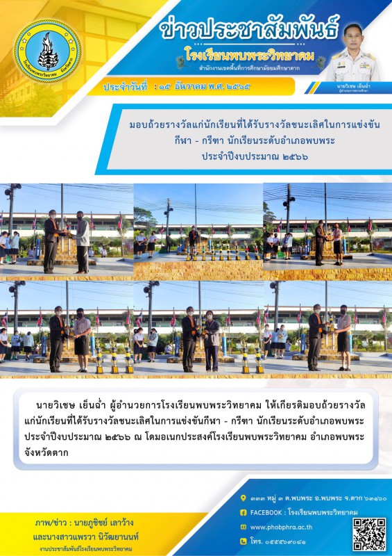 นายวิเชษ เย็นฉ่ำ ผู้อำนวยการโรงเรียนพบพระวิทยาคม ให้เกียรติมอบถ้วยรางวัลแก่นักเรียนที่ได้รับรางวัลชนะเลิศในการแข่งขันกีฬา - กรีฑา นักเรียนระดับอำเภอพบพระ ประจำปีงบประมาณ ๒๕๖๖ ณ โดมอเนกประสงค์โรงเรียนพบพระวิทยาคม อำเภอพบพระ จังหวัดตาก |
