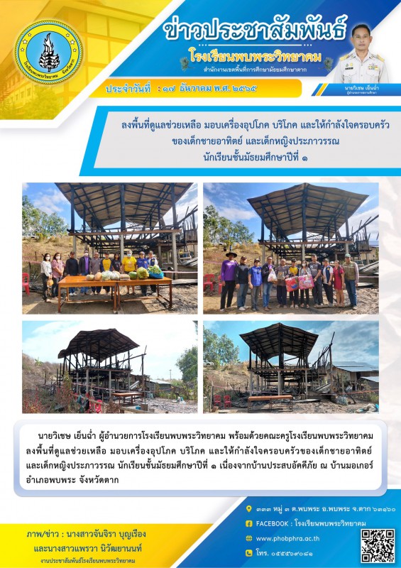 นายวิเชษ เย็นฉ่ำ ผู้อำนวยการโรงเรียนพบพระวิทยาคม พร้อมด้วยคณะครูโรงเรียนพบพระวิทยาคม ลงพื้นที่ดูแลช่วยเหลือ มอบเครื่องอุปโภค บริโภค และให้กำลังใจครอบครัวของเด็กชายอาทิตย์ และเด็กหญิงประภาวรรณ นักเรียนชั้นมัธยมศึกษาปีที่ ๑ เนื่องจากบ้านประสบอัคคีภัย ณ บ้านมอเกอร์ อำเภอพบพระ จังหวัดตาก |