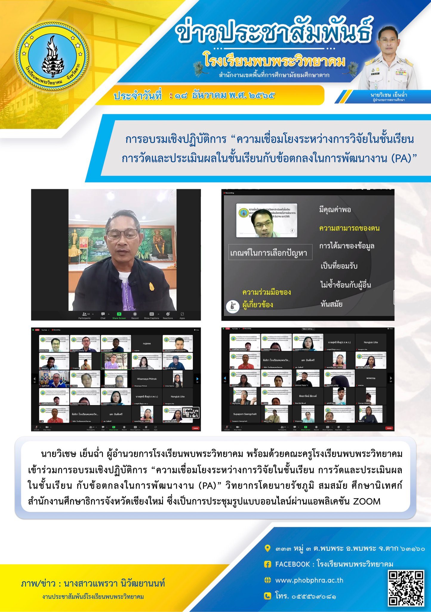 นายวิเชษ เย็นฉ่ำ ผู้อำนวยการโรงเรียนพบพระวิทยาคม พร้อมด้วยคณะครูโรงเรียนพบพระวิทยาคม เข้าร่วมการอบรมเชิงปฏิบัติการ “ความเชื่อมโยงระหว่างการวิจัยในชั้นเรียน การวัดและประเมินผลในชั้นเรียน กับข้อตกลงในการพัฒนางาน (PA)” วิทยากรโดยนายรัชภูมิ สมสมัย ศึกษานิเทศก์สำนักงานศึกษาธิการจังหวัดเชียงใหม่ ซึ่งเป็นการประชุมรูปแบบออนไลน์ผ่านแอปพลิเคชัน ZOOM |