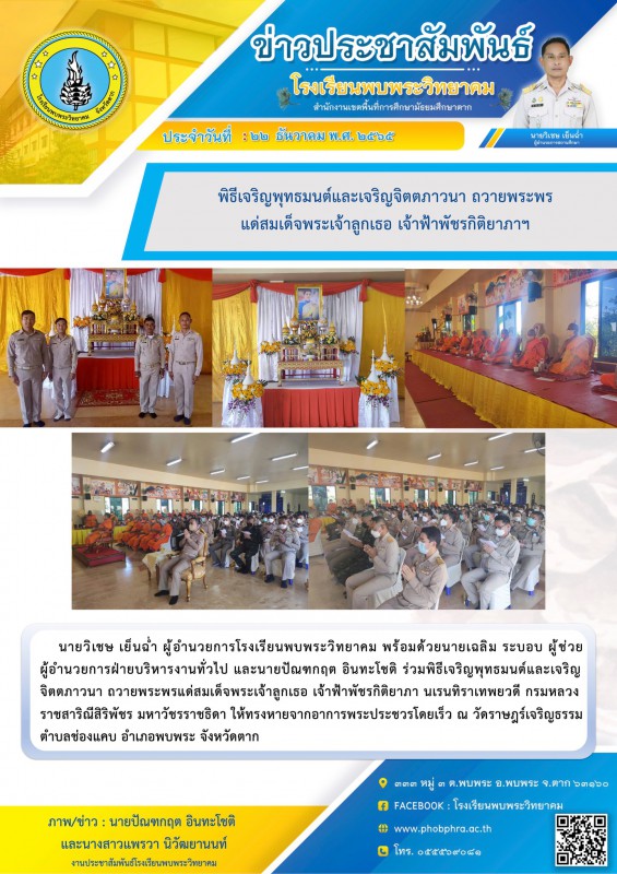 นายวิเชษ เย็นฉ่ำ ผู้อำนวยการโรงเรียนพบพระวิทยาคม พร้อมด้วยนายเฉลิม ระบอบ ผู้ช่วยผู้อำนวยการฝ่ายบริหารงานทั่วไป และนายปัณฑกฤต อินทะโชติ ร่วมพิธีเจริญพุทธมนต์และเจริญ จิตตภาวนา ถวายพระพรแด่สมเด็จพระเจ้าลูกเธอ เจ้าฟ้าพัชรกิติยาภา นเรนทิราเทพยวดี กรมหลวง ราชสาริณีสิริพัชร มหาวัชรราชธิดา ให้ทรงหายจากอาการพระประชวรโดยเร็ว ณ วัดราษฎร์เจริญธรรม ตำบลช่องแคบ อำเภอพบพระ จังหวัดตาก |