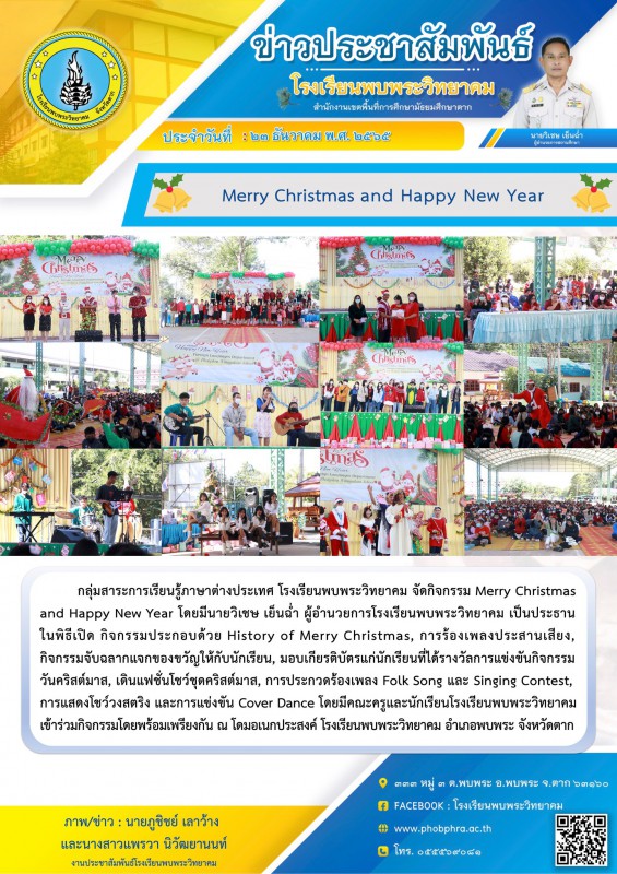 กลุ่มสาระการเรียนรู้ภาษาต่างประเทศ โรงเรียนพบพระวิทยาคม จัดกิจกรรม Merry Christmas and Happy New Year โดยมีนายวิเชษ เย็นฉ่ำ ผู้อำนวยการโรงเรียนพบพระวิทยาคม เป็นประธานในพิธีเปิด กิจกรรมประกอบด้วย History of Merry Christmas, การร้องเพลงประสานเสียง, กิจกรรมจับฉลากแจกของขวัญให้กับนักเรียน, มอบเกียรติบัตรแก่นักเรียนที่ได้รางวัลการแข่งขันกิจกรรมวันคริสต์มาส, เดินแฟชั่นโชว์ชุดคริสต์มาส, การประกวดร้องเพลง Folk Song และ Singing Contest, การแสดงโชว์วงสตริง และการแข่งขัน Cover Dance โดยมีคณะครูและนักเรียนโรงเรียนพบพระวิทยาคมเข้าร่วมกิจกรรมโดยพร้อมเพรียงกัน ณโดมอเนกประสงค์ โรงเรียนพบพระวิทยาคม อำเภอพบพระ จังหวัดตาก