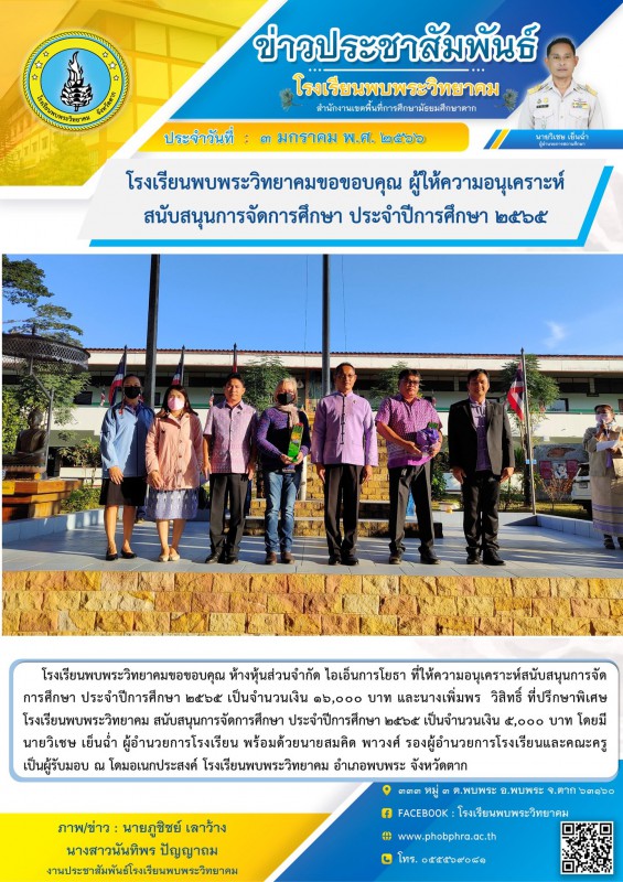 โรงเรียนพบพระวิทยาคมขอขอบคุณ ห้างหุ้นส่วนจำกัด ไอเอ็นการโยธา ที่ให้ความอนุเคราะห์สนับสนุนการจัดการศึกษา ประจำปีการศึกษา ๒๕๖๕ เป็นจำนวนเงิน ๑๖,๐๐๐ บาท และนางเพิ่มพร วิสิทธิ์ ที่ปรึกษาพิเศษโรงเรียนพบพระวิทยาคม สนับสนุนการจัดการศึกษา ประจำปีการศึกษา ๒๕๖๕ เป็นจำนวนเงิน ๕,๐๐๐ บาท โดยมีนายวิเชษ เย็นฉ่ำ ผู้อำนวยการโรงเรียน พร้อมด้วยนายสมคิด พาวงศ์ รองผู้อำนวยการโรงเรียนและคณะครู เป็นผู้รับมอบ ณ โดมอเนกประสงค์ โรงเรียนพบพระวิทยาคม อำเภอพบพระ จังหวัดตาก |