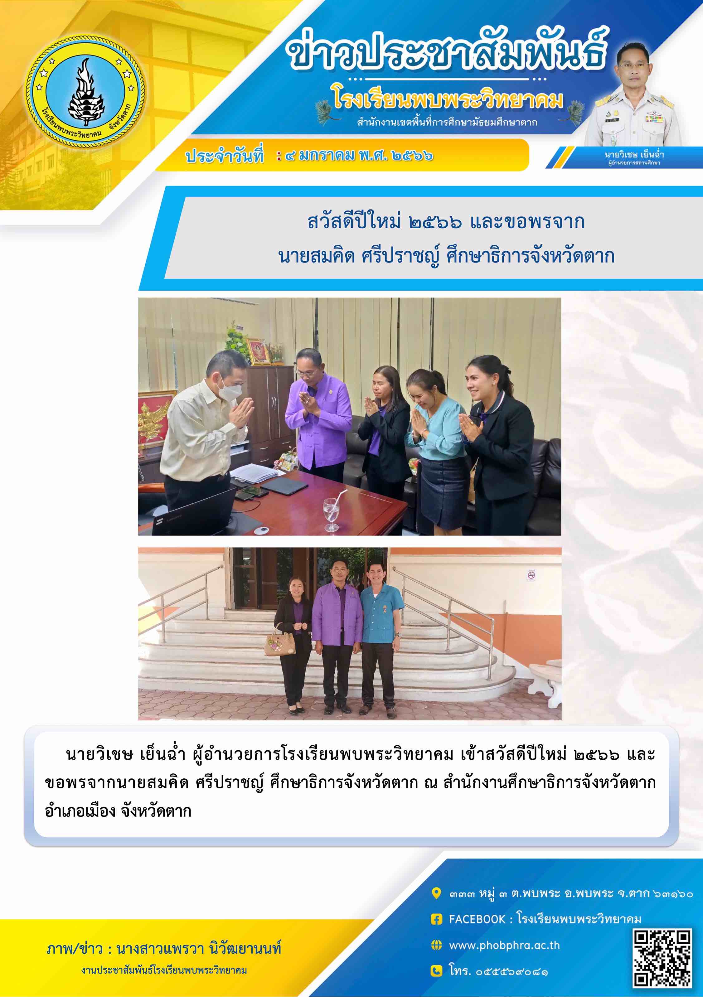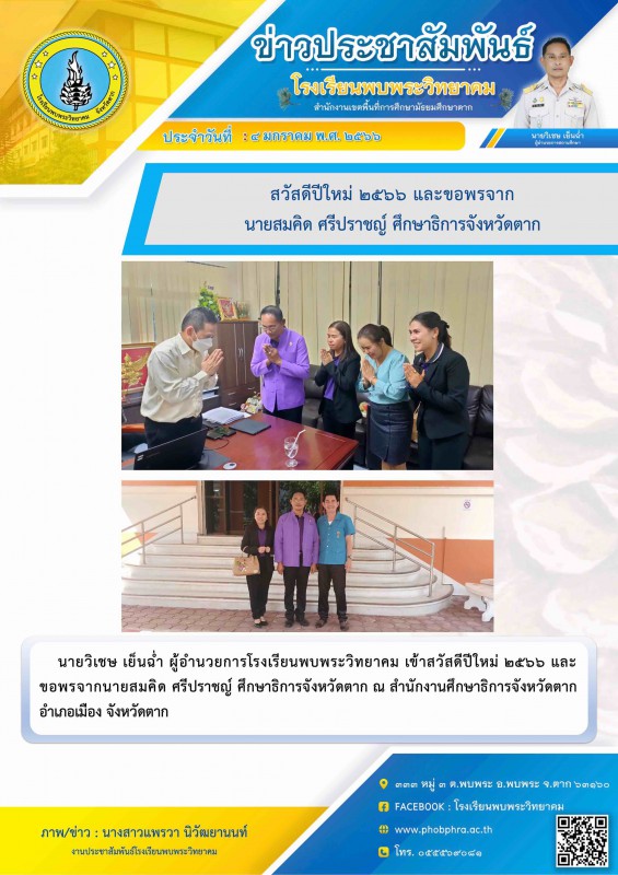 นายวิเชษ เย็นฉ่ำ ผู้อำนวยการโรงเรียนพบพระวิทยาคม เข้าสวัสดีปีใหม่ ๒๕๖๖ และขอพรจากนายสมคิด ศรีปราชญ์ ศึกษาธิการจังหวัดตาก ณ สำนักงานศึกษาธิการจังหวัดตาก อำเภอเมือง จังหวัดตาก |