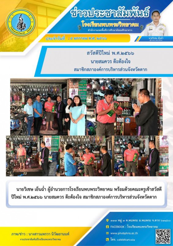 นายวิเชษ เย็นฉ่ำ ผู้อำนวยการโรงเรียนพบพระวิทยาคม พร้อมด้วยคณะครูเข้าสวัสดีปีใหม่ พ.ศ.๒๕๖๖ นายสมควร ต๊ะต้องใจ สมาชิกสภาองค์การบริหารส่วนจังหวัดตาก |