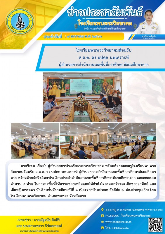 7 ม.ค. 65 โรงเรียนพบพระวิทยาคมต้อนรับ ส.ต.ต. ดร.นปดล นพเคราะห์ ผู้อำนวยการสำนักงานเขตพื้นที่การศึกษามัธยมศึกษาตาก