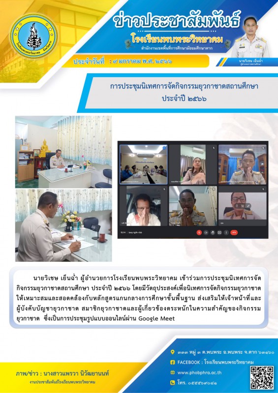 นายวิเชษ เย็นฉ่ำ ผู้อำนวยการโรงเรียนพบพระวิทยาคม เข้าร่วมการประชุมนิเทศการจัดกิจกรรมยุวกาชาดสถานศึกษา ประจำปี ๒๕๖๖ โดยมีวัตถุประสงค์เพื่อนิเทศการจัดกิจกรรมยุวกาชาดให้เหมาะสมและสอดคล้องกับหลักสูตรแกนกลางการศึกษาขั้นพื้นฐาน ส่งเสริมให้เจ้าหน้าที่และผู้บังคับบัญชายุวกาชาด สมาชิกยุวกาชาดและผู้เกี่ยวข้องตระหนักในความสำคัญของกิจกรรมยุวกาชาด ซึ่งเป็นการประชุมรูปแบบออนไลน์ผ่าน Google Meet |