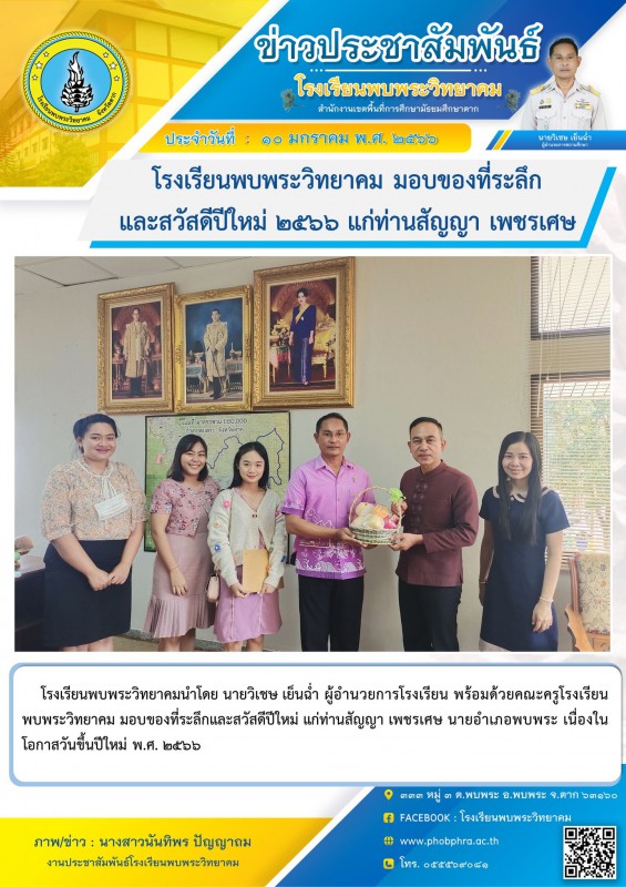 โรงเรียนพบพระวิทยาคมนำโดย นายวิเชษ เย็นฉ่ำ ผู้อำนวยการโรงเรียน พร้อมด้วยคณะครูโรงเรียนพบพระวิทยาคม มอบของที่ระลึกและสวัสดีปีใหม่ แก่ท่านสัญญา เพชรเศษ นายอำเภอพบพระ เนื่องในโอกาสวันขึ้นปีใหม่ พ.ศ. 2566 |