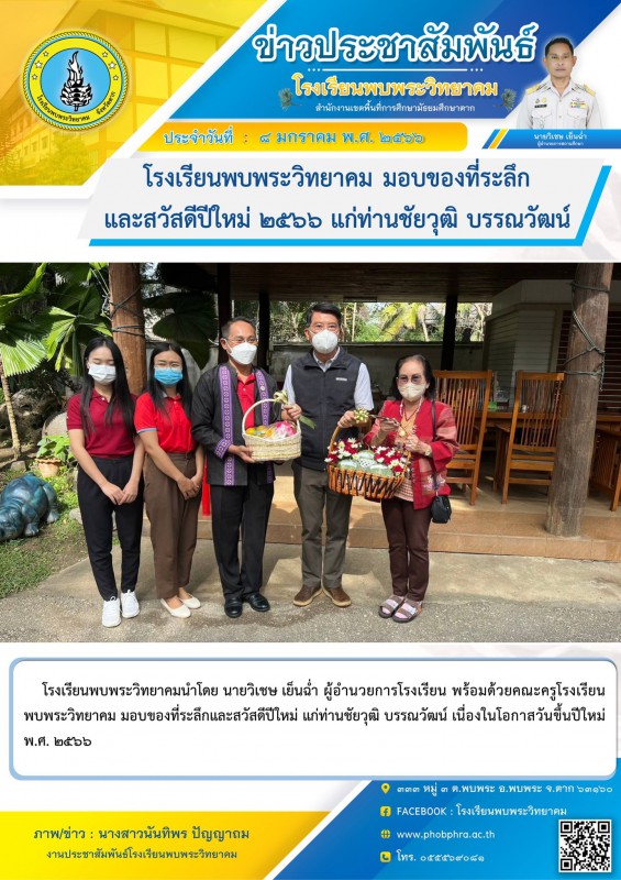 โรงเรียนพบพระวิทยาคมนำโดย นายวิเชษ เย็นฉ่ำ ผู้อำนวยการโรงเรียน พร้อมด้วยคณะครูโรงเรียนพบพระวิทยาคม มอบของที่ระลึกและสวัสดีปีใหม่ แก่ท่านชัยวุฒิ บรรณวัฒน์ เนื่องในโอกาสวันขึ้นปีใหม่ พ.ศ. 2566 |